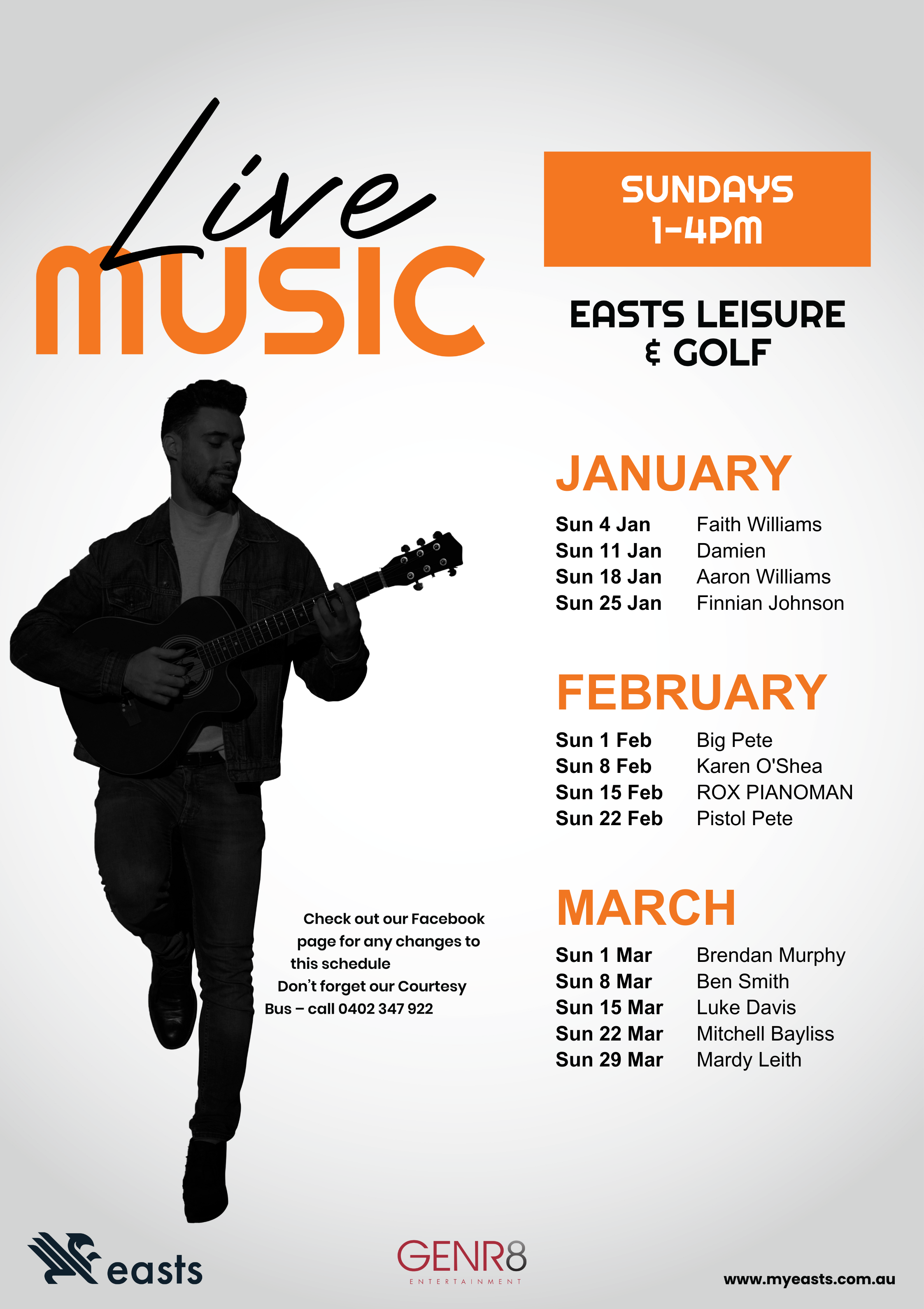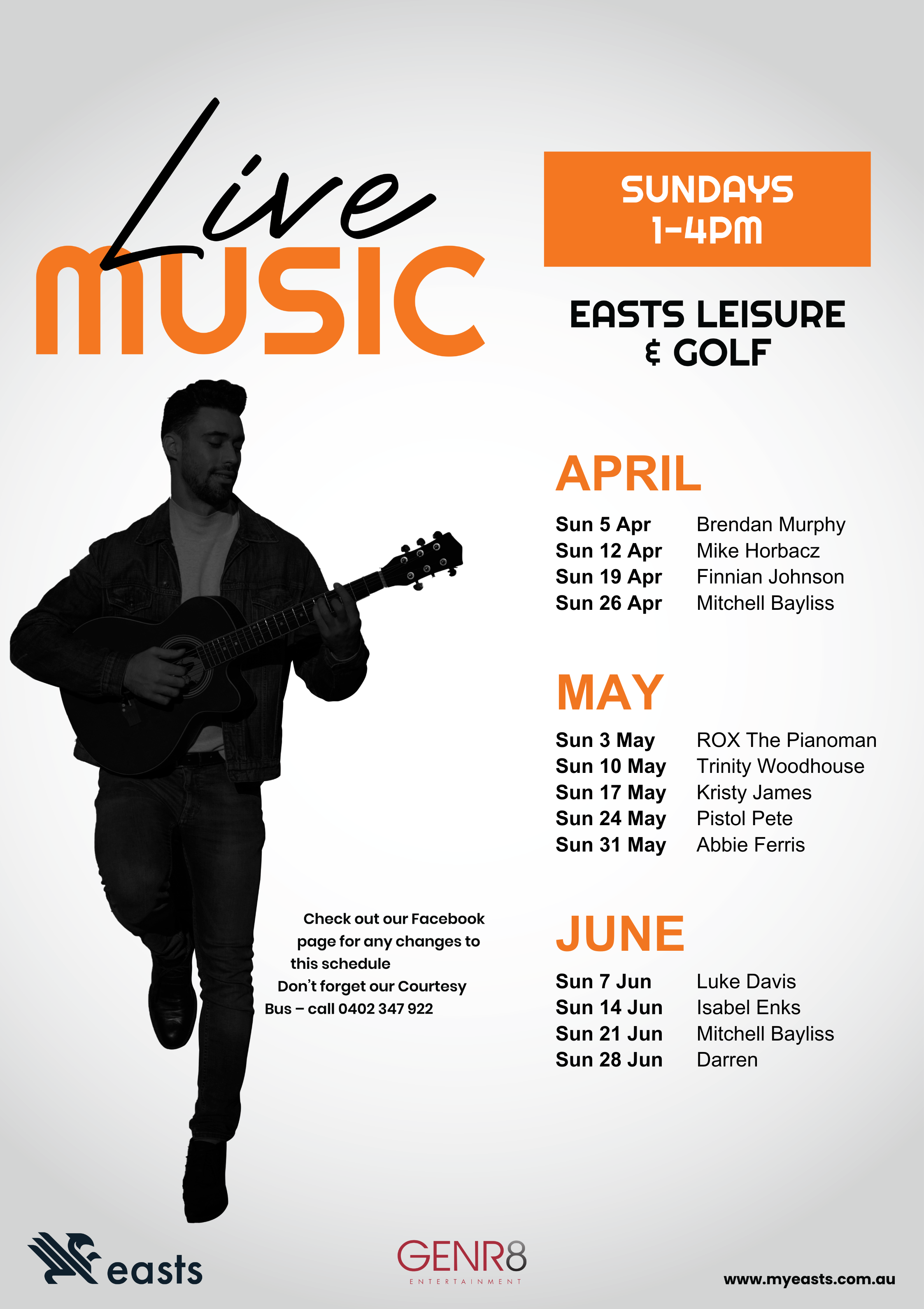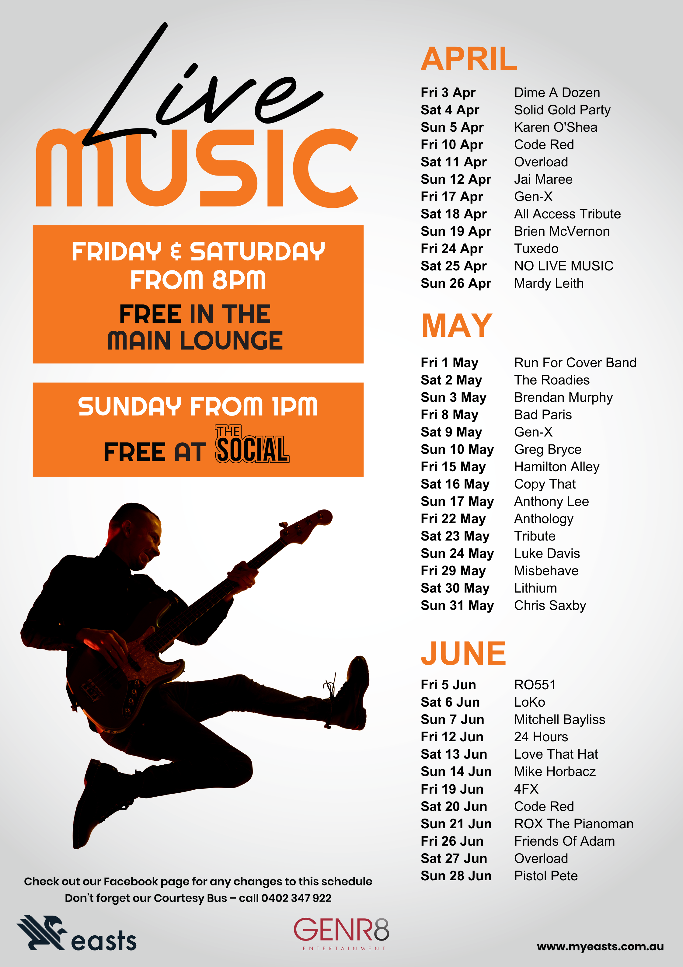 At Easts, we are proud to showcase some of the region's best talent, with a changing schedule of live music playing every week: